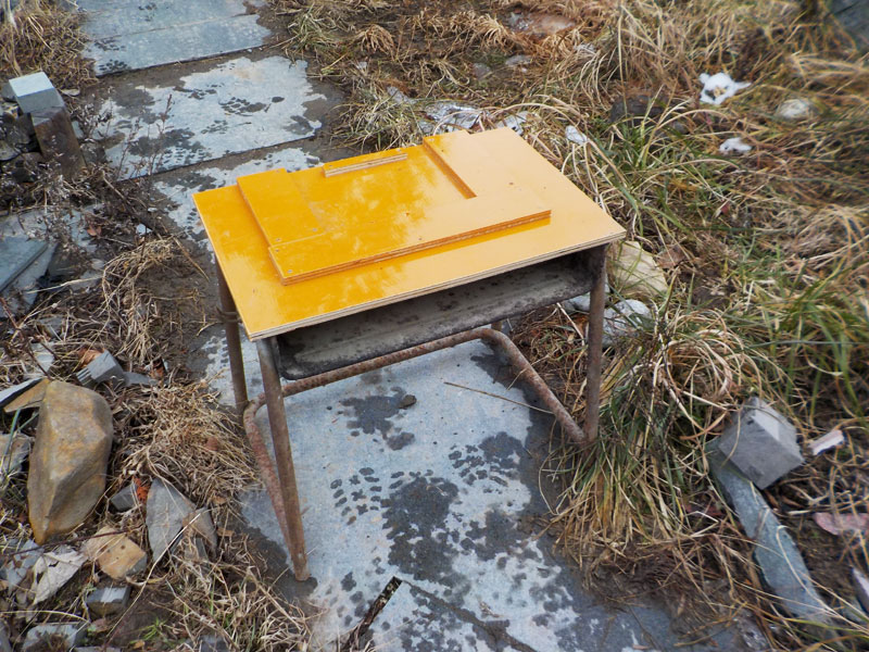 ピッタリはめれば変な振動が無くて使いやすい。この机は小学校からもらってきたもの。低学年用のすごく低いこの高さが作業台には最適なのだ。