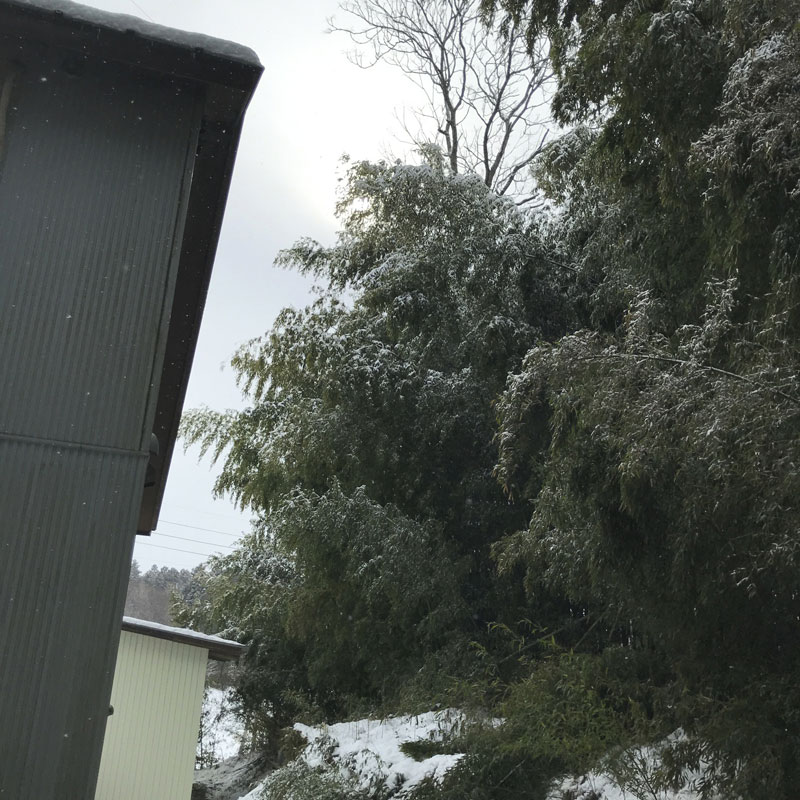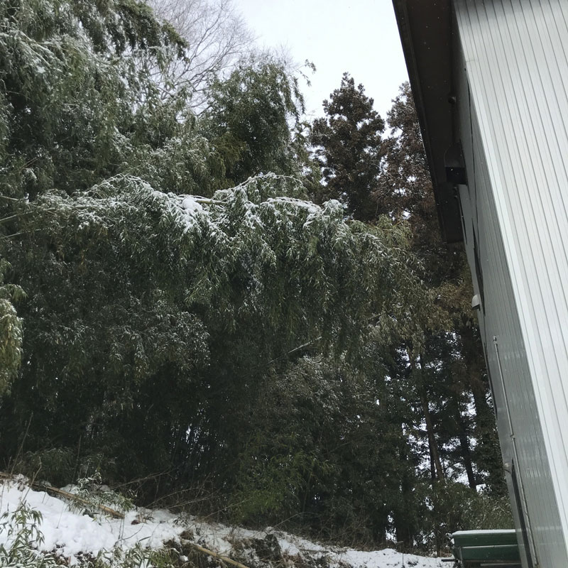 雪の重みで竹が何本も家にもたれかかってる。