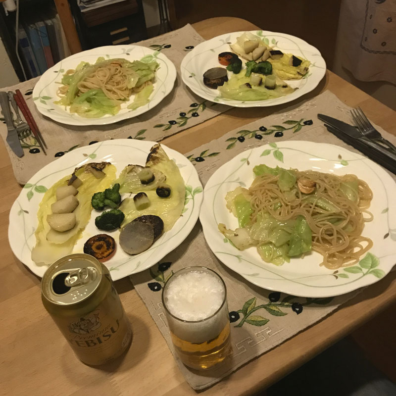 居酒屋我家、開店。カミさんがアンチョビとキャベツのパスタ作ってくれてる間に、マイブームの瞬間蒸し野菜作る。