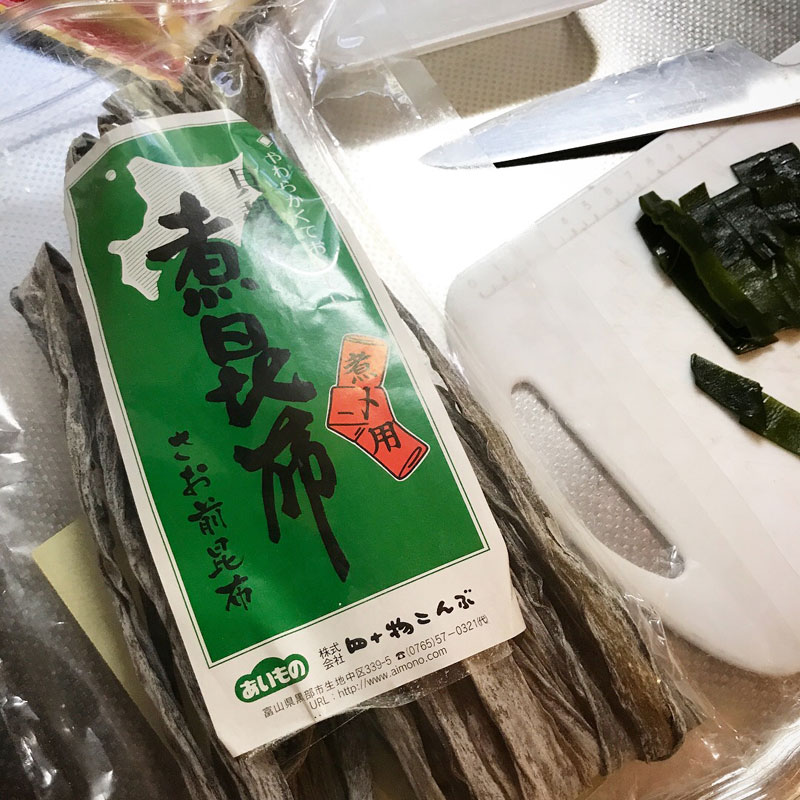 冷蔵庫に塩蔵昆布があったので初めてだけどそれも入れてみる。
