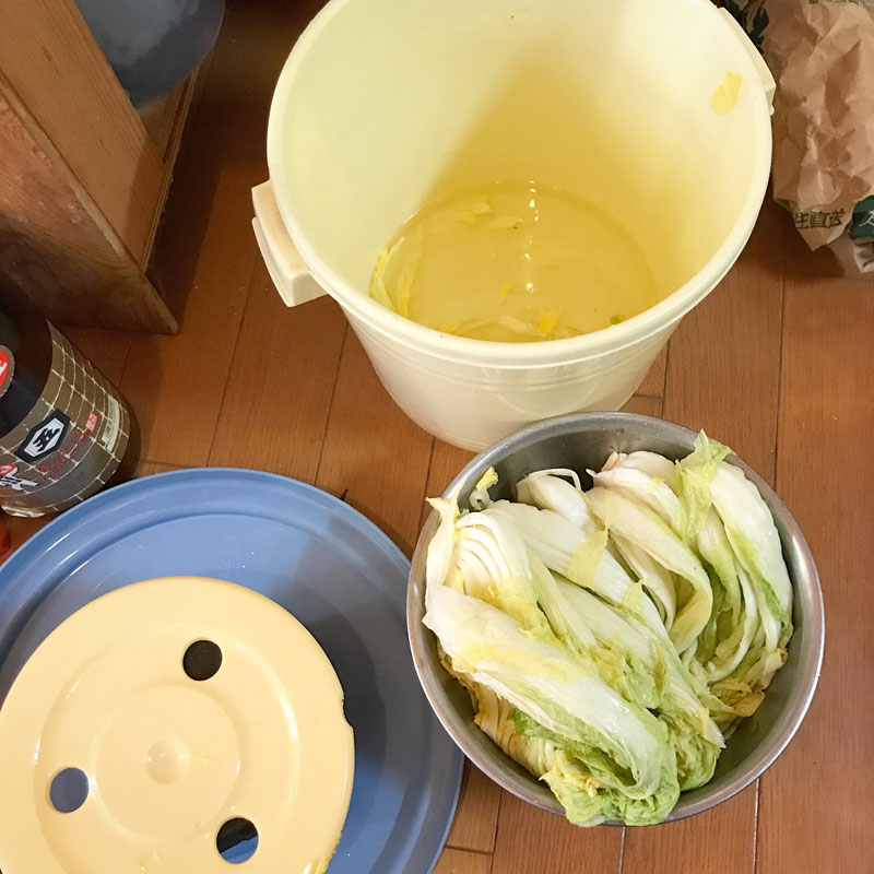 白菜漬けの水があがったので、風味付けする。シンプルに昆布と鷹の爪と柚子だけ入れるのが定番。