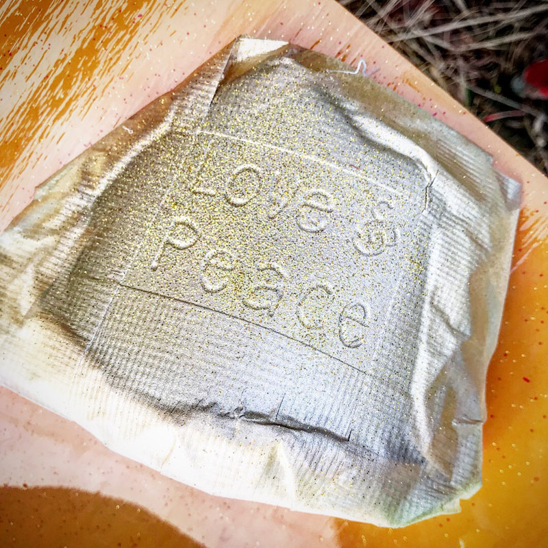文字を彫ったところにゴールドの着色と金ラメをまぶす。