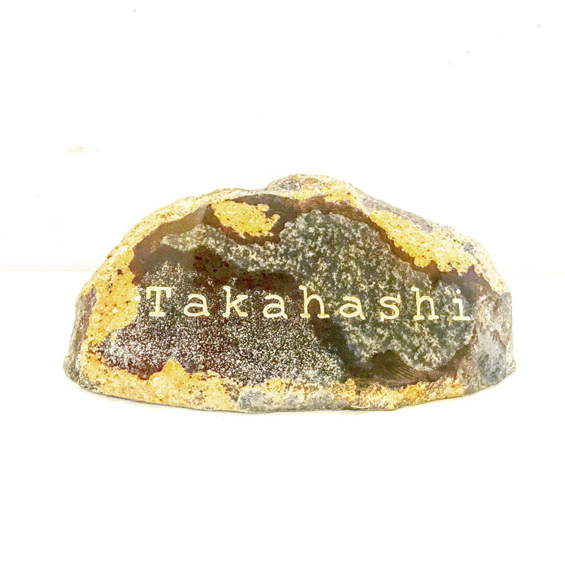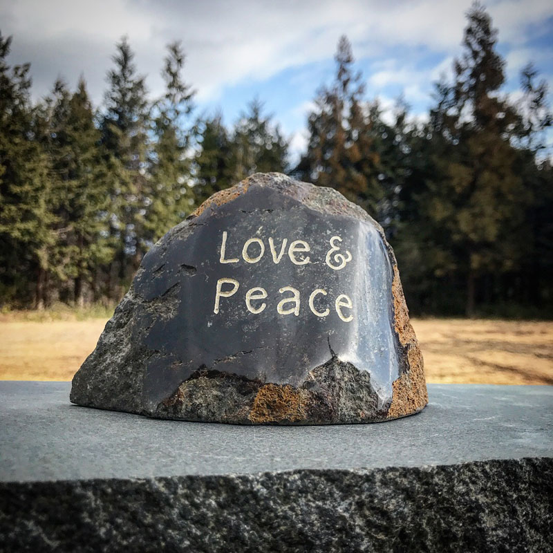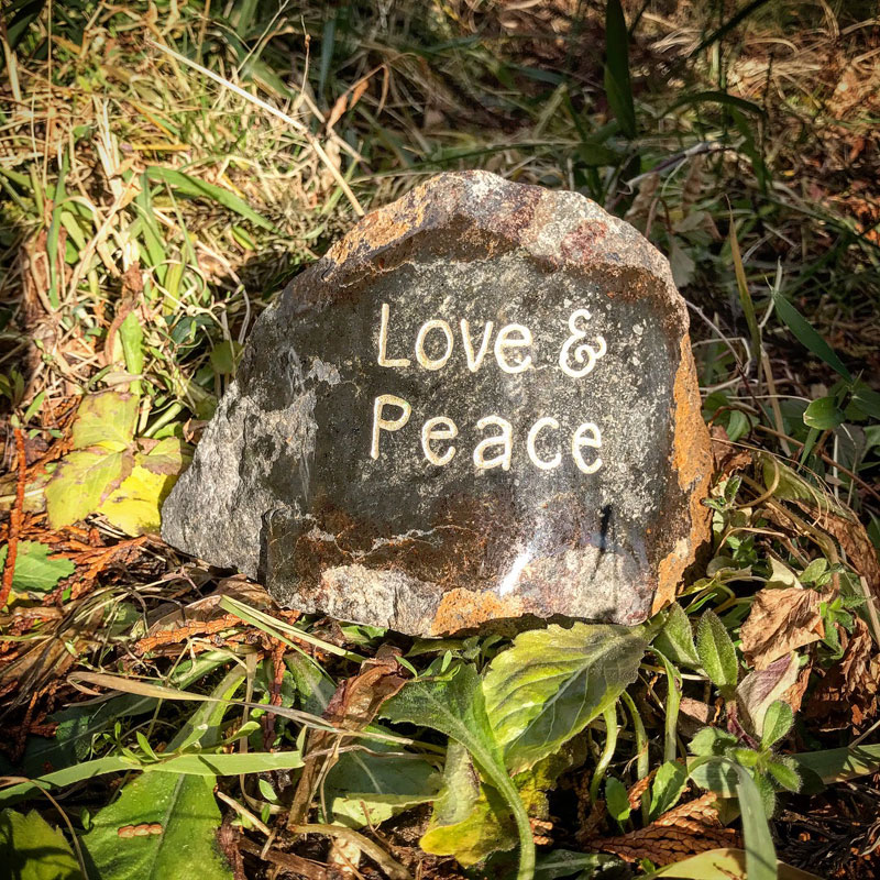 伊達冠石の表皮の泥部分を残しつつ一部を削って磨いて”Love & Peace”と彫って金ラメで着色。