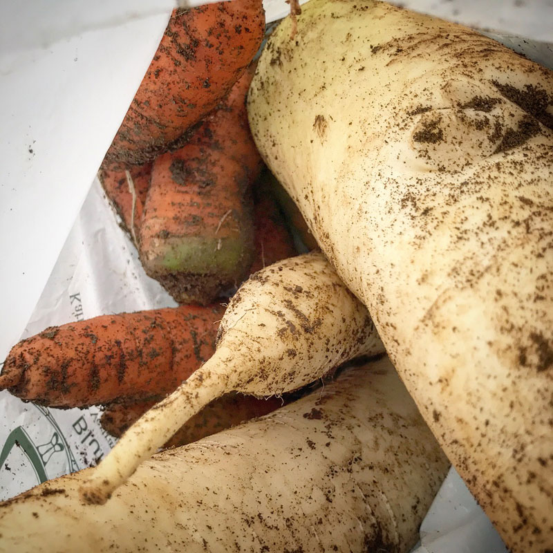 そしたら、ハウスの土の中に埋めてある大根と人参、それと白菜をいただいた。なんだか催促したみたいになってる・苦笑