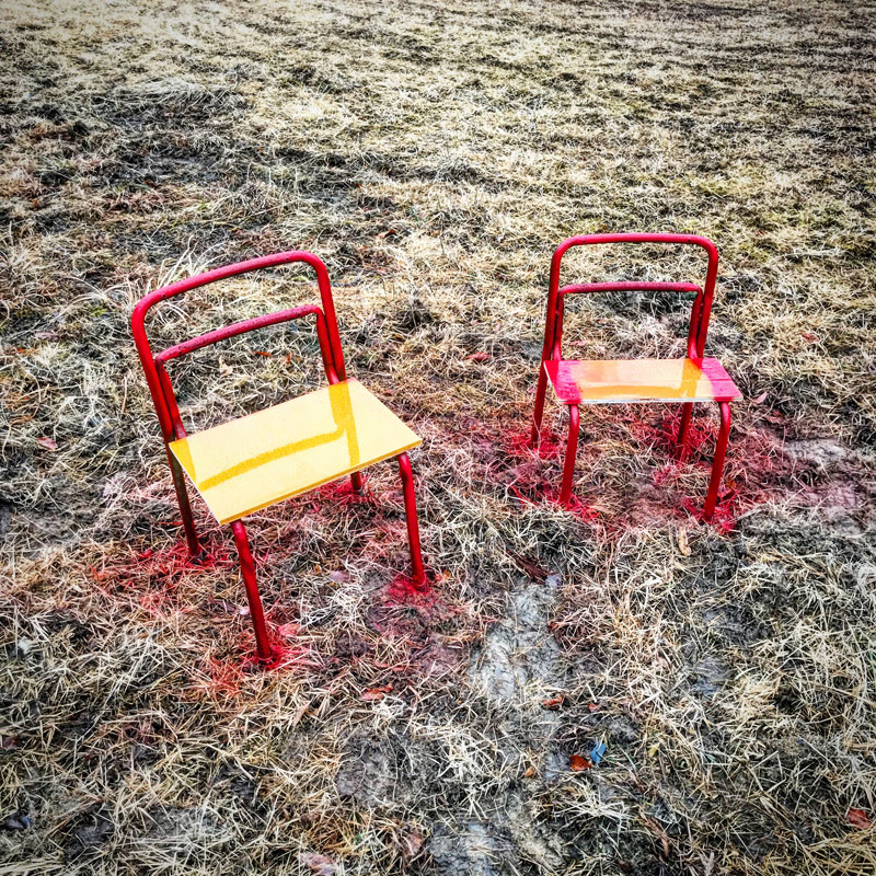 昨日、座板をコンパネで貼り直してペンキ塗っておいた仕事場の椅子。雨の前に乾いたみたい。