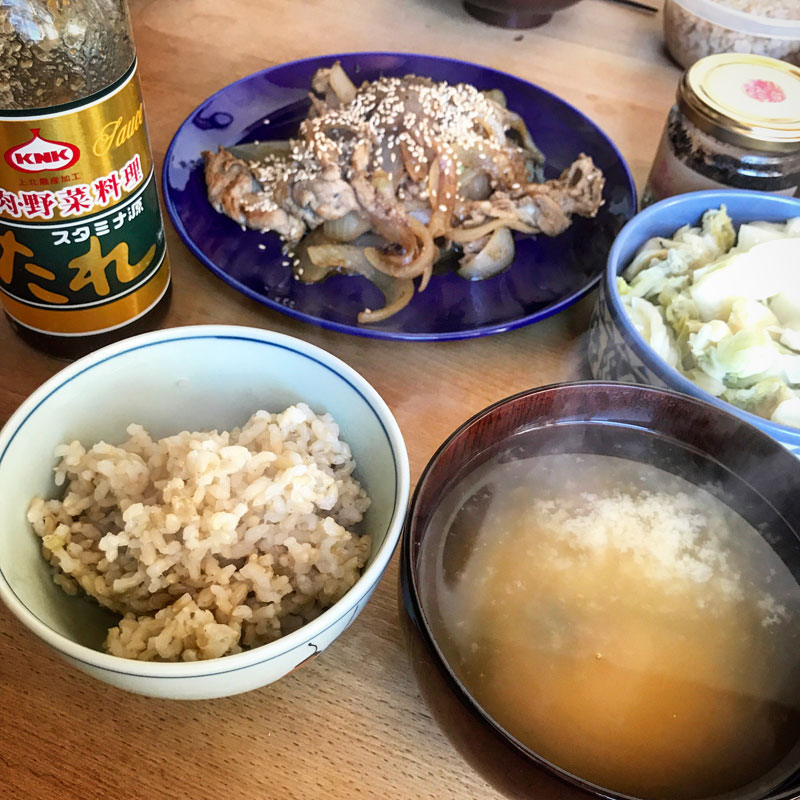庭で育てた「げんきまる」のご飯で昼飯。スタミナ源たれで味付けすれば、ただの玉ねぎと豚肉がご馳走に。