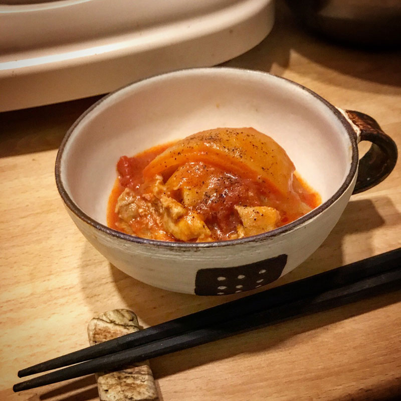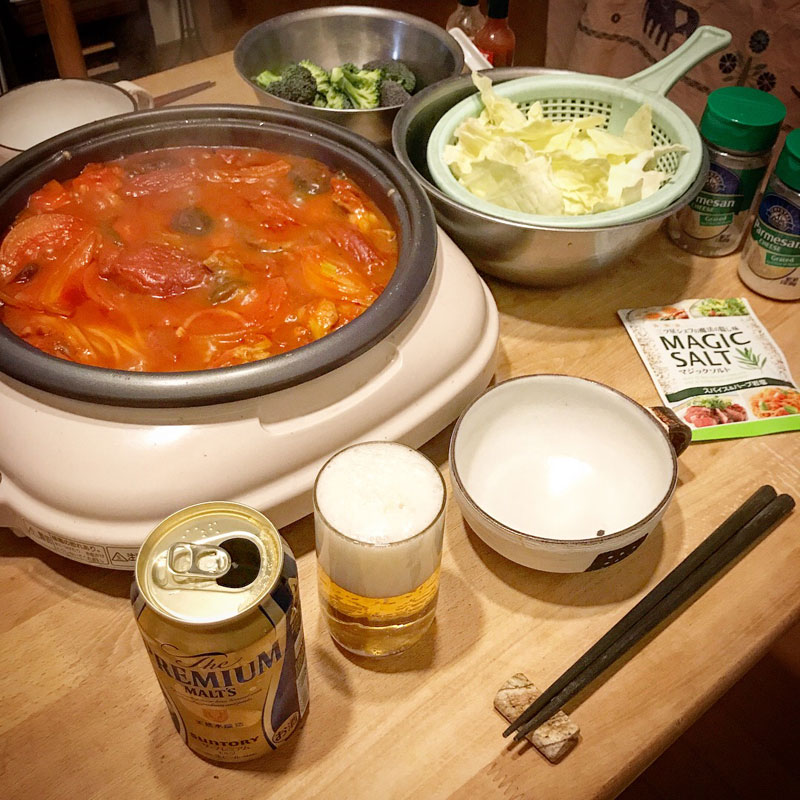 居酒屋我家、開店。思いつきでトマト鍋。オリーブオイルにニンニクの香り移して、ホールとカットのトマト缶ひとつずつ入れる。鶏肉、しいたけ、人参、キャベツ、ブロッコリー投入。塩控えめにして取り分けた後で黒胡椒挽いて粉チーズ。いただいたプレミアム・モルツ。