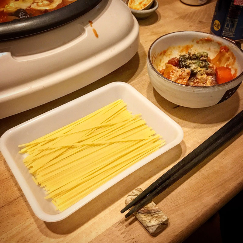 〆にスライスチーズとそうめんの様に細いパスタ、カッペリーニ半分に折って投入。