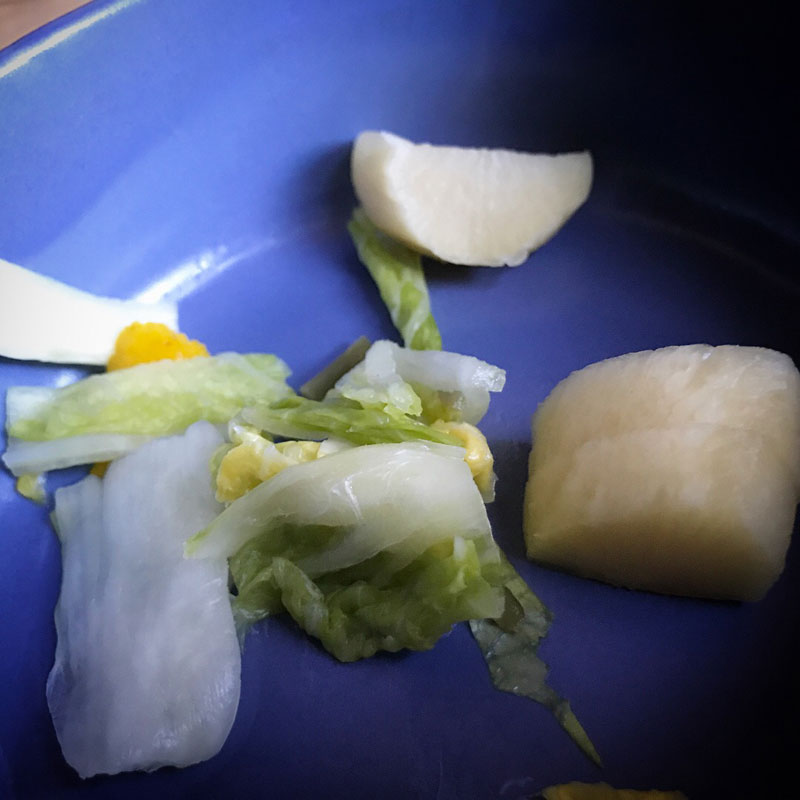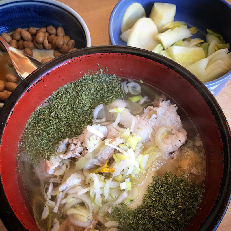昨晩の鍋をベースで昼に雑煮。畑の大根葉で作ったふりかけたっぷりとかけて。いつも白菜をくれる部落の方が漬けたたくあん、自家製白菜と、玄米と大豆で作った自家製納豆。