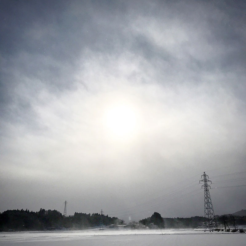 田んぼに降った雪は普通はどんどん溶けていくんだけど、あんまり寒くて溶ける気配無し。