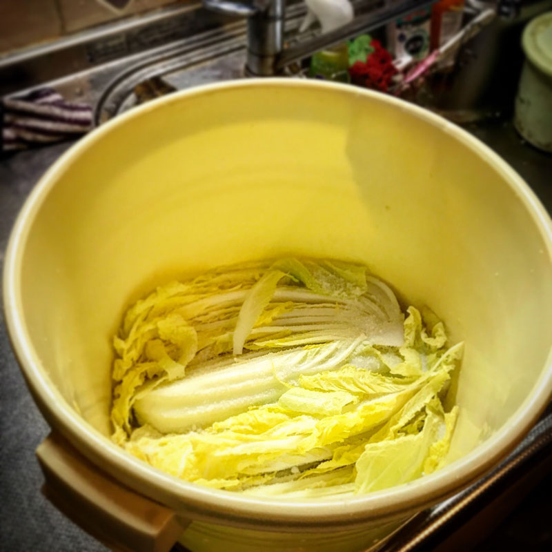 部落のばっぱが畑から白菜とって持ってきてくれた。スーパーの大きくて、でもぶよぶよの白菜で漬物作っても美味しくないので作ってなかったけど、この白菜いただいたら話は別。
