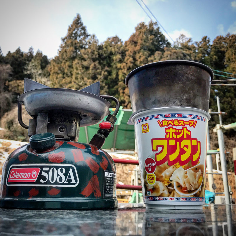仕事場のプレハブに備蓄してあるカップ。賞味期限が過ぎそうだったので仕事前に身体温める。