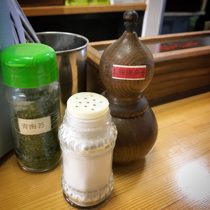 白胡椒以外に青海苔と七味唐辛子が置いてあるのが面白い。七味が意外に合うよ。