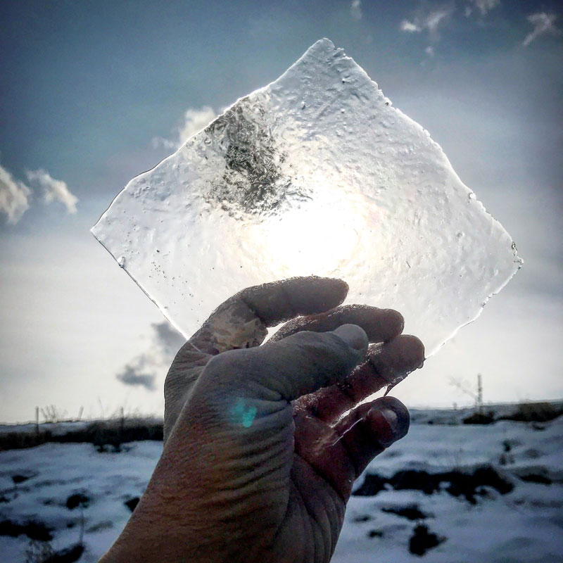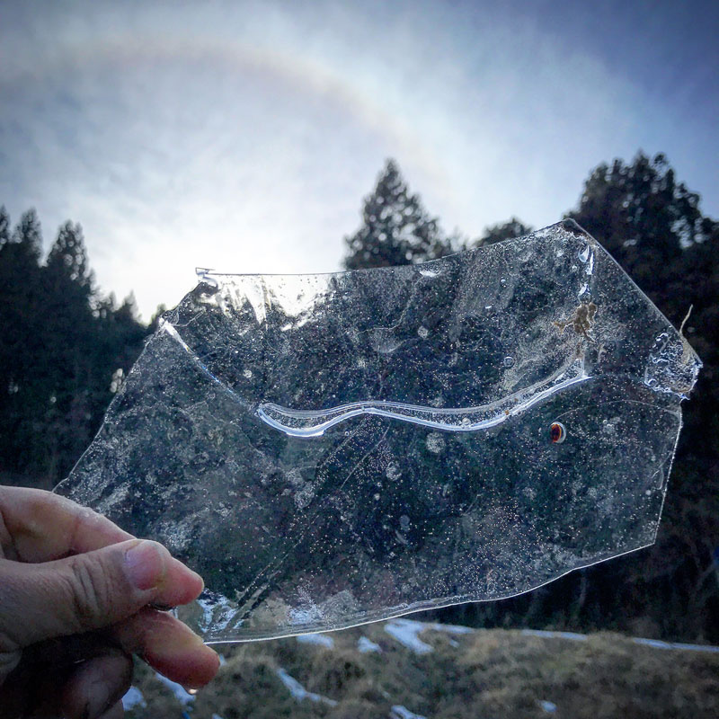 持っている間に体温で融けてしまう薄い薄い氷。分厚い氷はもう出来ないかな。朝、水が凍ってない日も増えてきた。