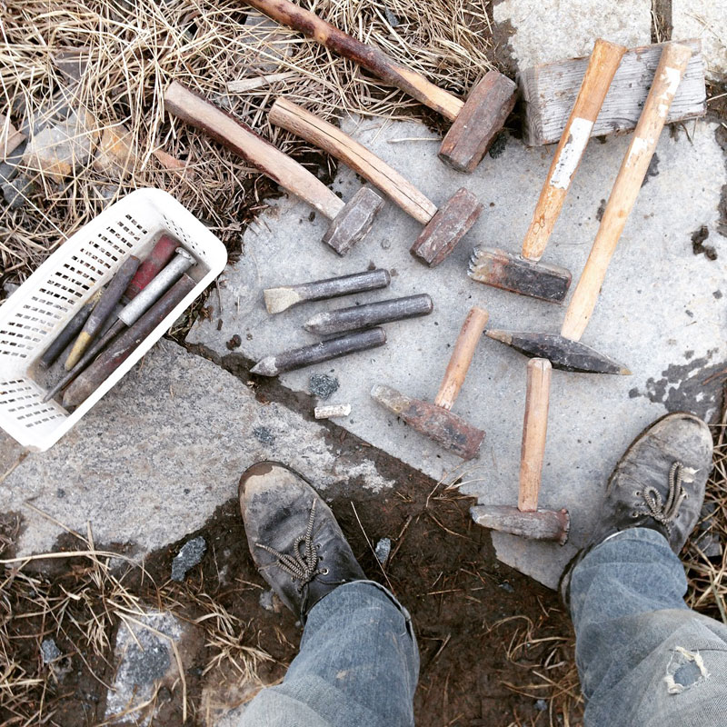 いろんな道具で。ノミ、コヤスケ、刃トンボ、ビシャン、平田がね。