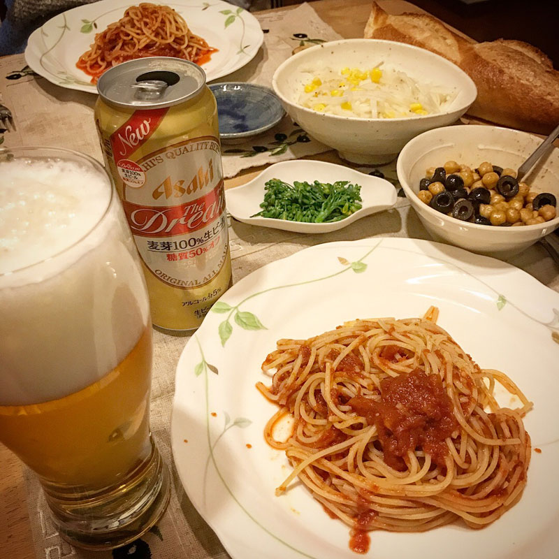 居酒屋我家、開店。週の中日と週末に開店するよ(笑)トマトソースのパスタ。庭の畑のコールラビの菜花のおひたし(味が濃い!)ひよこ豆と黒オリーブのスペイン風、大根とコーンのサラダ。バゲット。