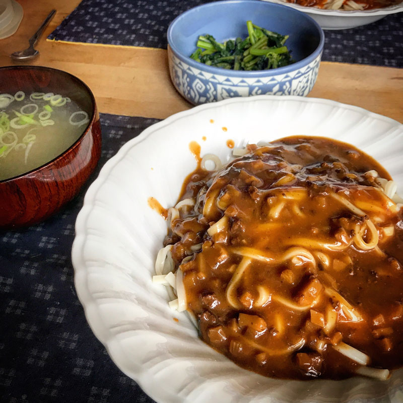 早速、甘めの出汁で豚肉と玉ねぎと春菊を煮て、絹ごし豆腐を握りつぶしながら入れて、さっきまで畑にあった大量のニラを投入して卵でとじて丼にした。
