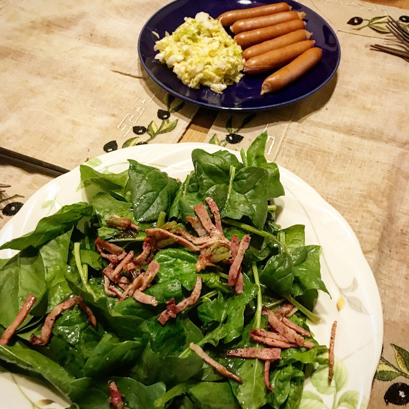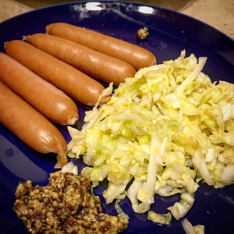 ボイルしたソーセージにカミさんが作ったキャベツの酢漬けと粒マスタードを添えて。