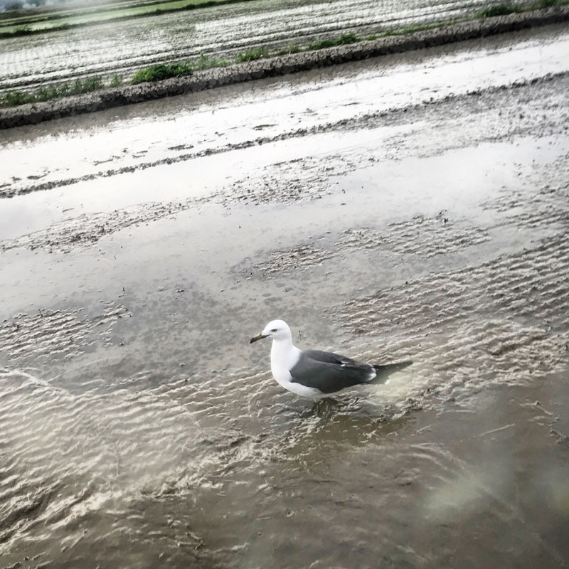 ウミネコは今年も田んぼにやって来てますよ。海じゃないのに田んぼの季節は海から飛んで来てる。この数年。名前の通り猫みたいな声で鳴いてうるさいんだよ。