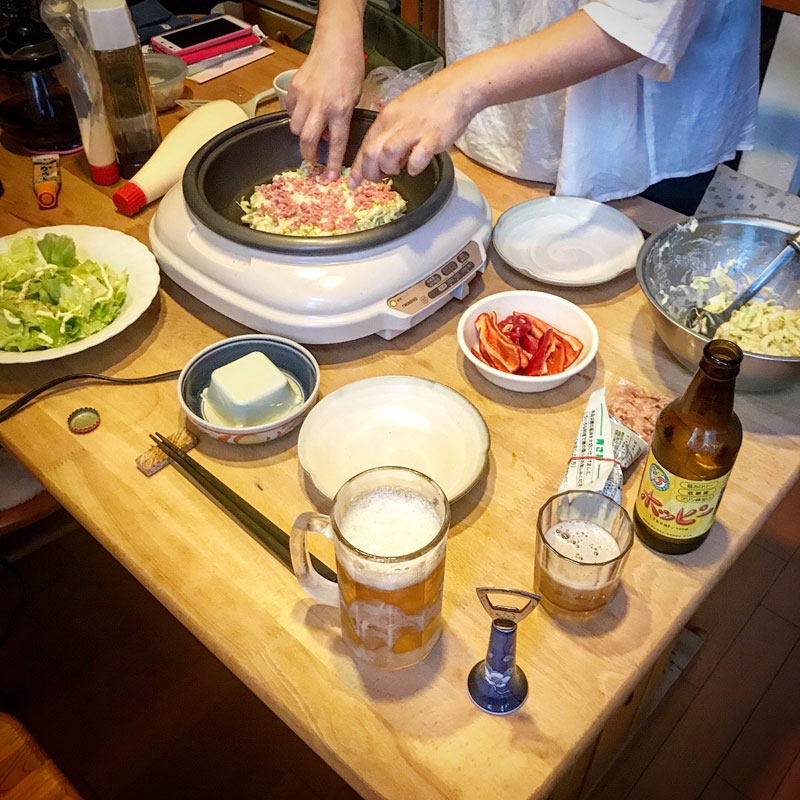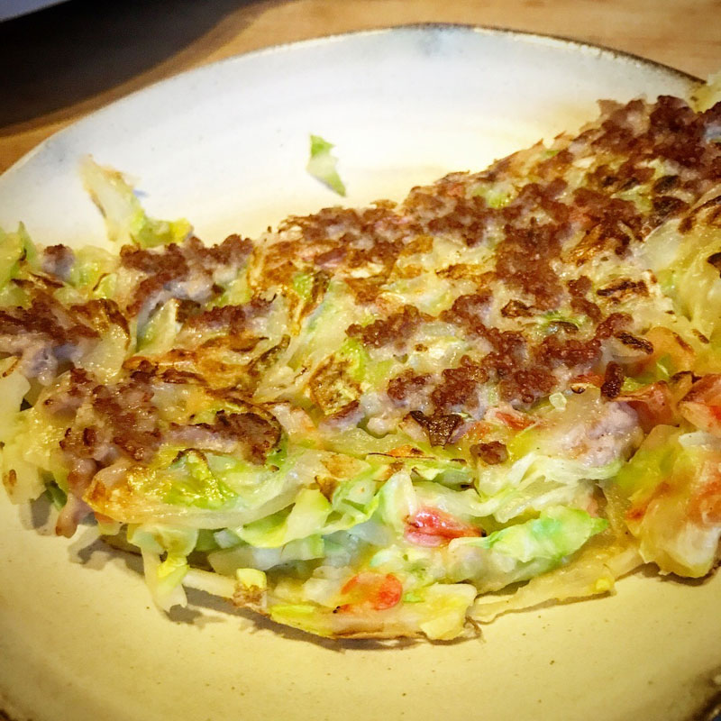 豚バラではなくひき肉を使う広島の府中焼き。広島での個展で連れて行っていただいて以来、我が家でお好み焼きといえば府中焼き!