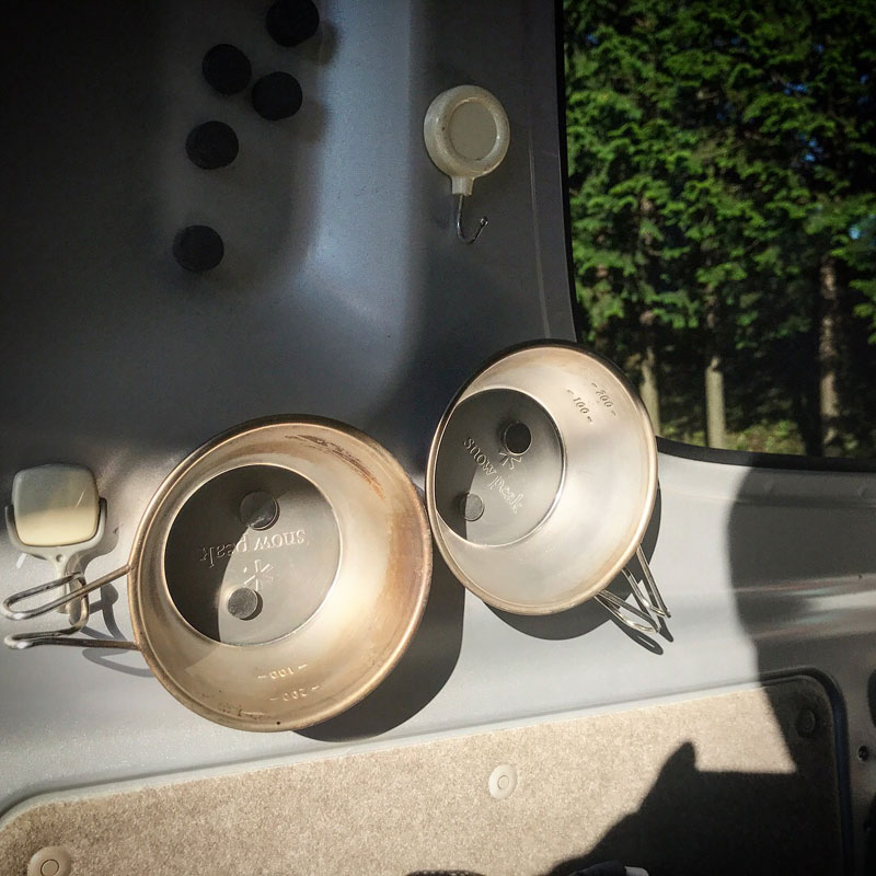 石彫り号にはいつでもお茶できるようにシェラカップを強力磁石で壁にとめてある。