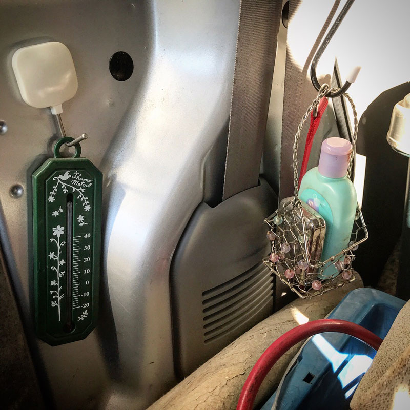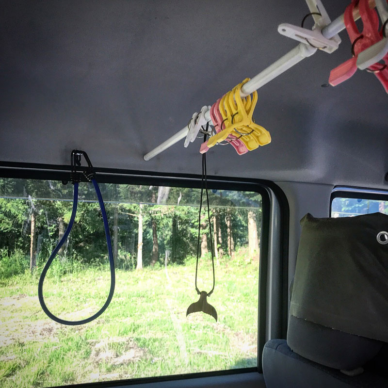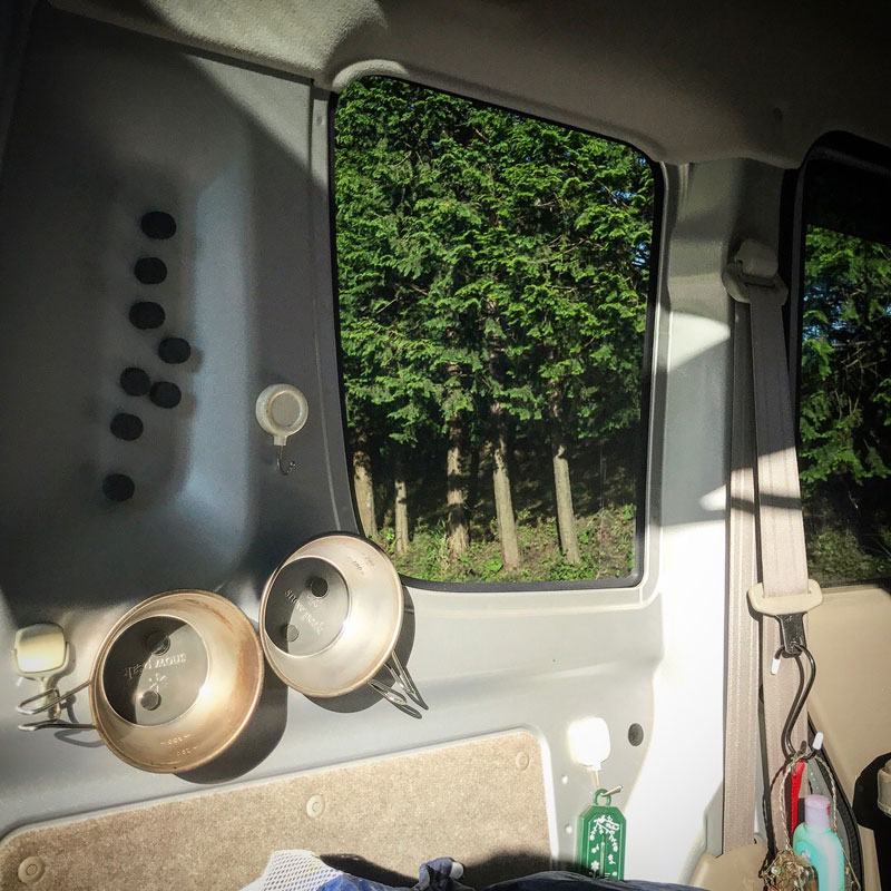 使ったタオルの干し場も。いざとなれば大人ふたりゆったり寝られるし1BOX車、やめられない・笑
