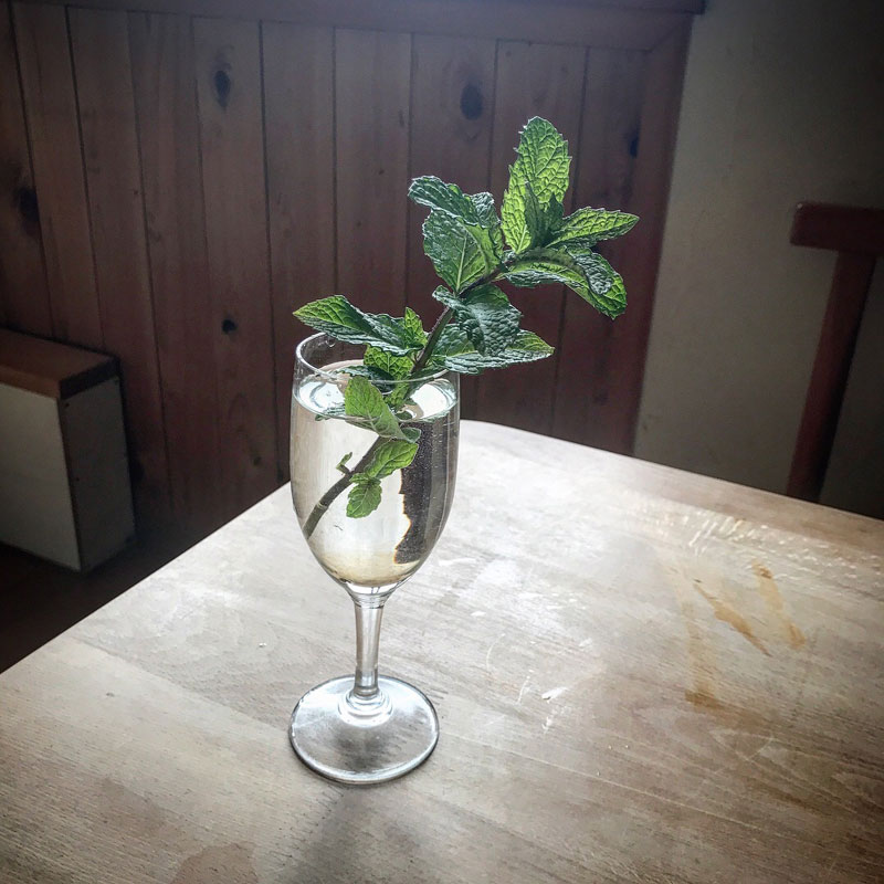 昼食に家に戻った。今宵、バーボンのカクテル、ミントジュレップ飲もうと畑のミント摘んでおいた。