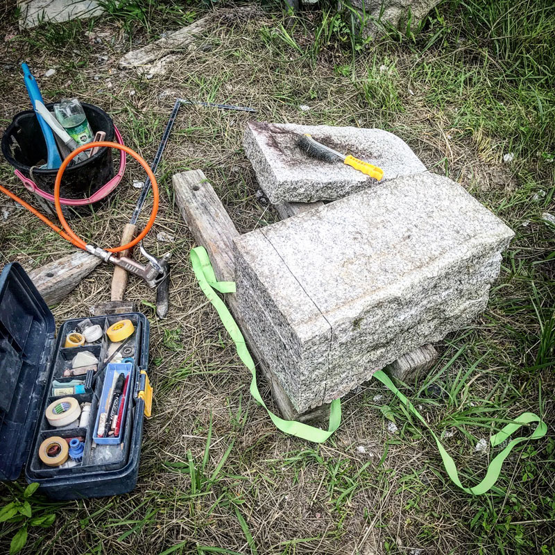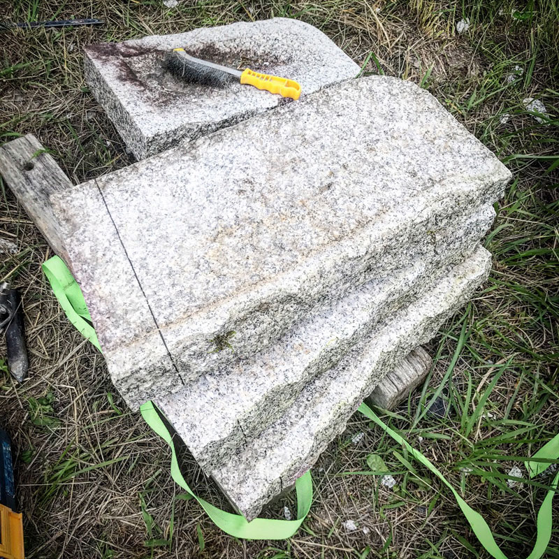 ひとつの塊を板状に3枚に割った白御影石で新作の制作中。ちょっとトリッキーな作品が多いけど自分が出来上がったところを見てみたいんだから仕方がない。