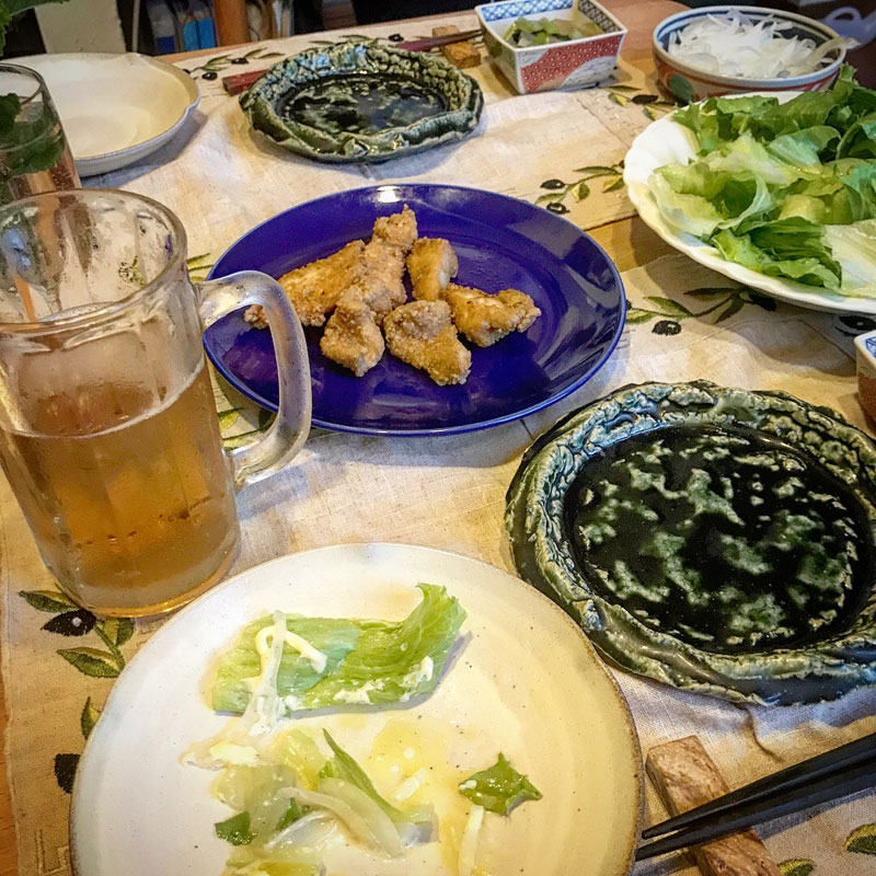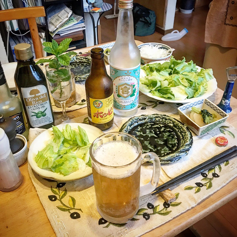 今日、部落の方にいただいた採りたてのレタスと野菜の煮物を突つきながらホッピー飲んで始めてると、鳥の唐揚げと
