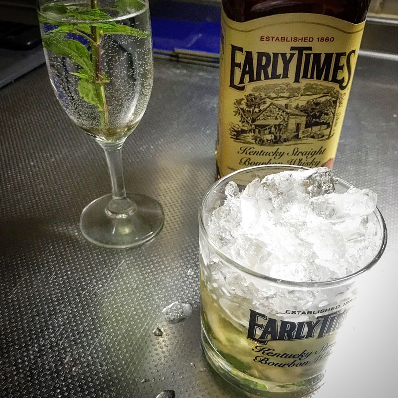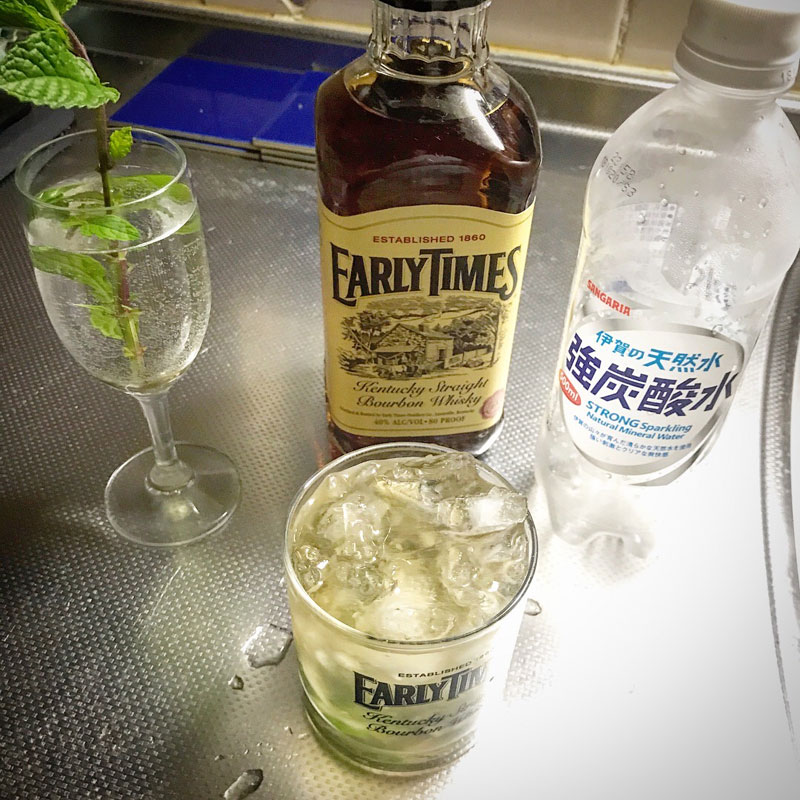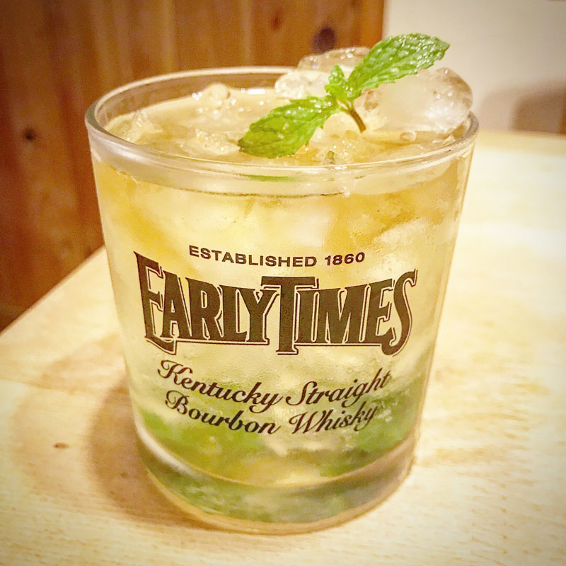 ミントの葉で飾ればミントジュレップの出来上がり。青臭さが美味しい。暑い日にはこれ。