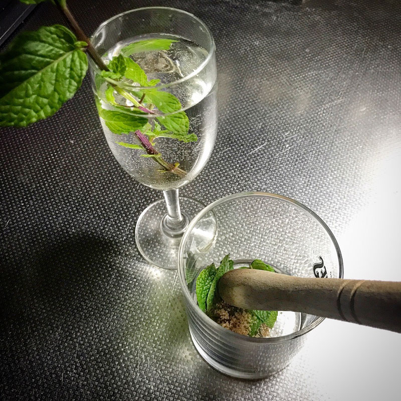 庭のミントをグラスに入れて少しの砂糖入れてミニスリコギでゴリゴリ。バーボンを少し注ぐ。
