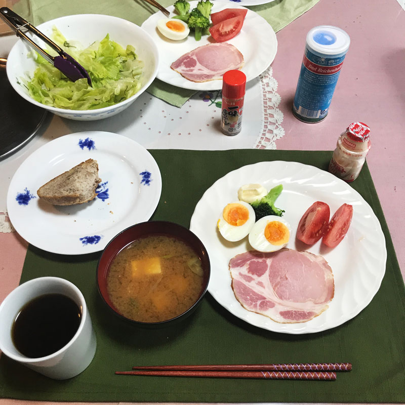 実家でのいつもの朝食。味噌汁とサラダと美味しいパン。