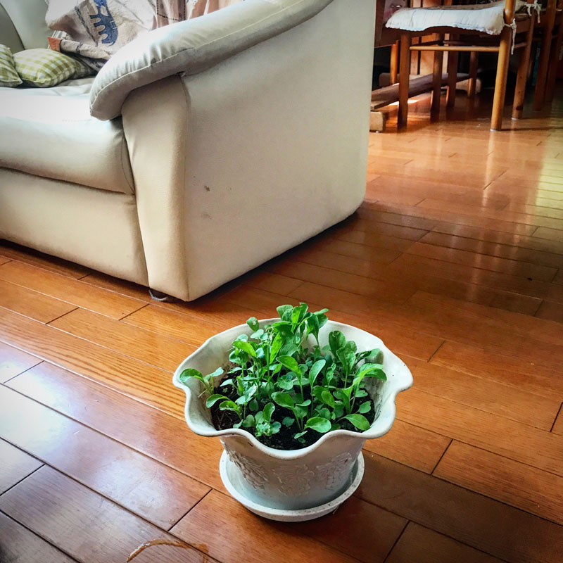 虫に食べられてしまうので、鉢のルッコラを居間に移動。