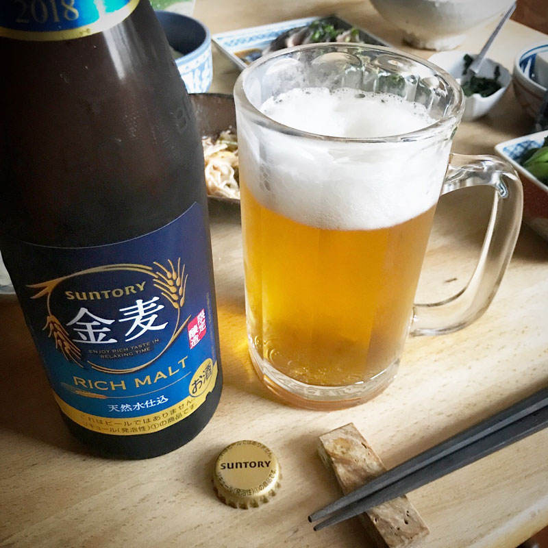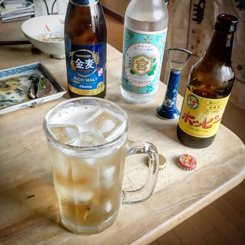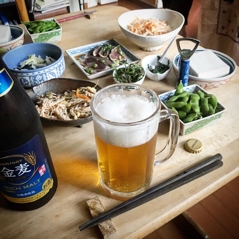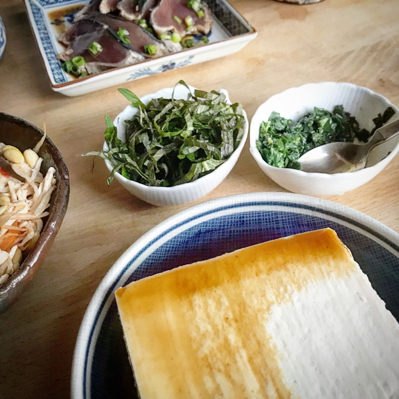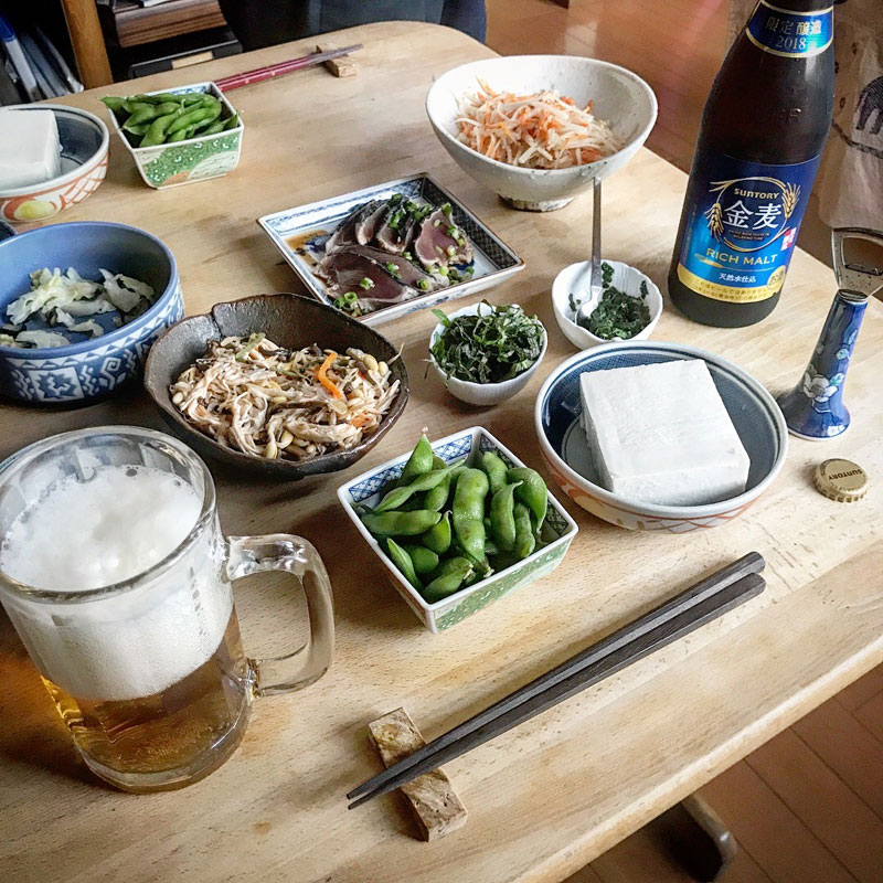 鰹のタタキ、鶏肉サラダ、枝豆、大根サラダ。冷奴には畑からシソの葉とモロヘイヤの葉を摘んできてトッピングに。