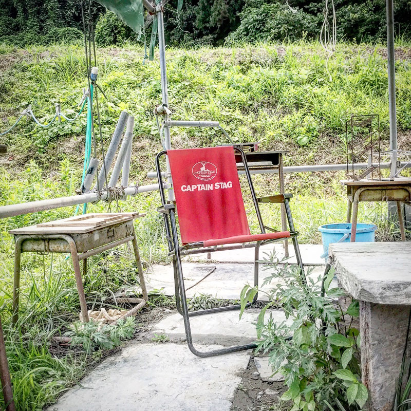 テント下の日陰にキャンプチェアー置いて休憩する。