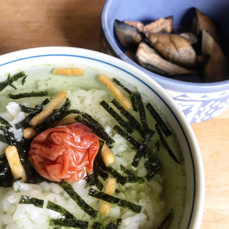 涼しくなってよかった。頼まれたら断らない事に決めてるけど、人前で話すのは苦手。いつもは抜いてる朝食を少しだけ食べて気合入れる。永谷園のお茶漬けに部落のばっぱの梅干しとMaoさんにもらった茄子の漬物。