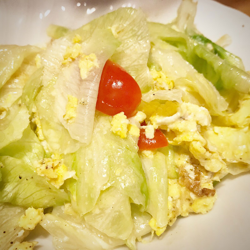いただいたレタスがたくさんでとてもサラダでは食べきれないので卵と合わせて炒め物に。油はマヨネーズで。