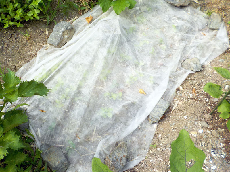 ルッコラ。不織布をかけたお陰でルッコラは虫に全滅させられずに今回は食べられそう。