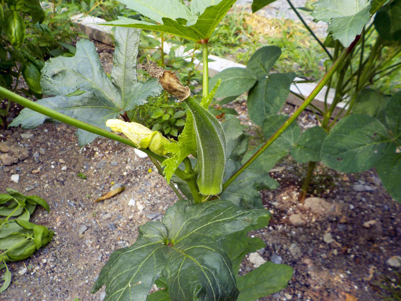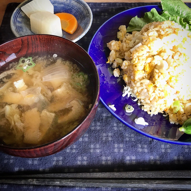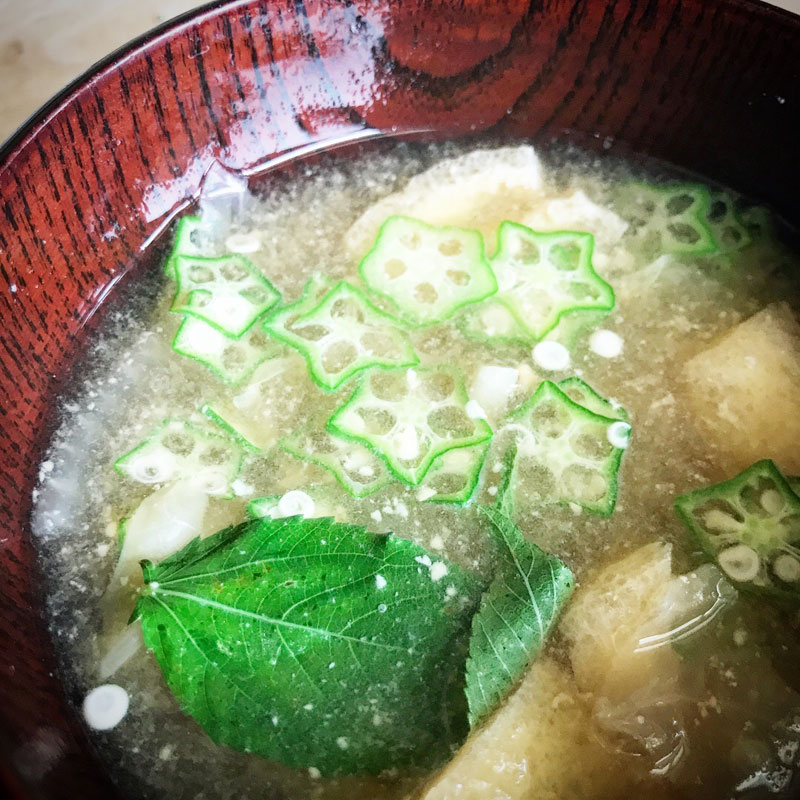 熱々の味噌汁には摘んできたモロヘイヤの葉とオクラをスライスして。夏はネバネバ最高!