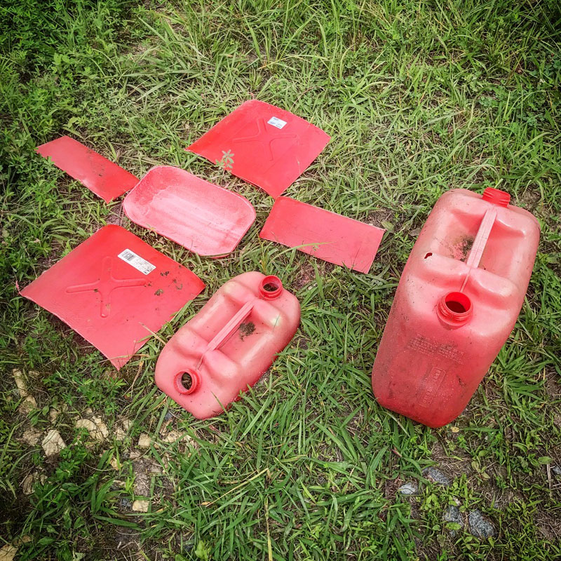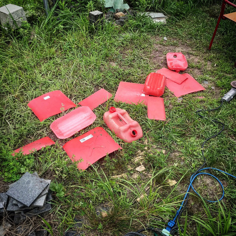 水道の通っていない仕事場で大量の水を使って石を磨くために家から水を運ぶのにポリ缶を使ってる。