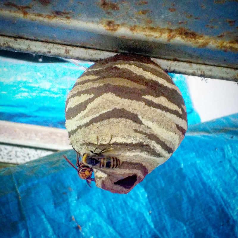やられた。家の裏にスズメバチに巣を作られた。今朝、家の裏の簡易な屋根だけかけた物置を整理していたらスズメバチがブンブン。捕獲器は見当違いのところに吊ってあった。そんなに大きくないスズメバチで数も少なかったので竹林の竹を刈って、遠くから突ついて走って逃げた。無事、地面に落とせたので落ち着いた頃片付ける。