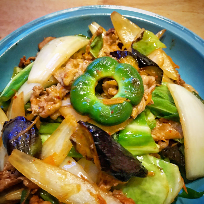 庭の畑のピーマンを太陽の様に切って肉野菜炒め。