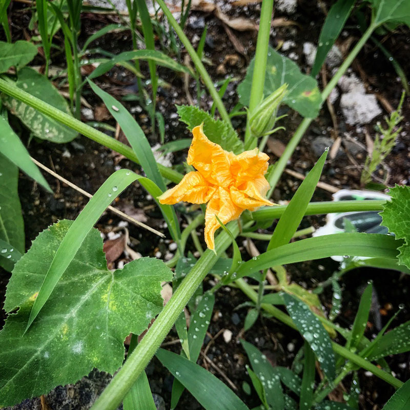 雨の中でも鮮やかなズッキーニの黄色い花。
