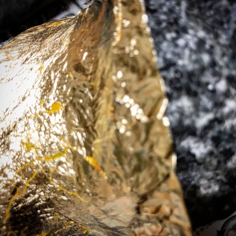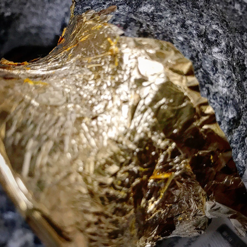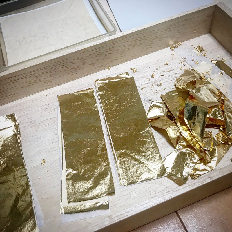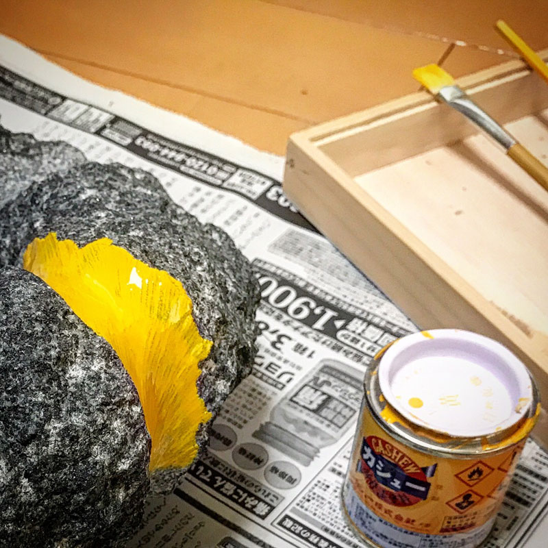 雨の日に、黒御影石に洋箔(真鍮箔)貼る。