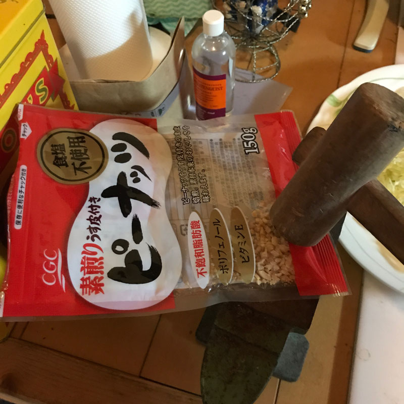松の実も胡桃もなかったのでピーナツを木槌で砕いて。
