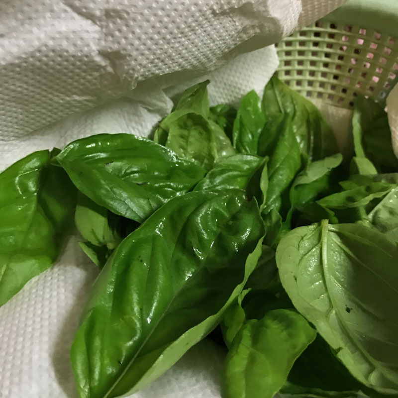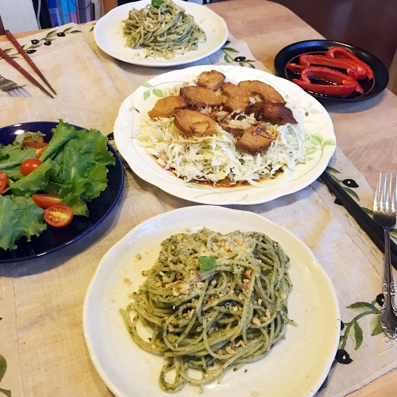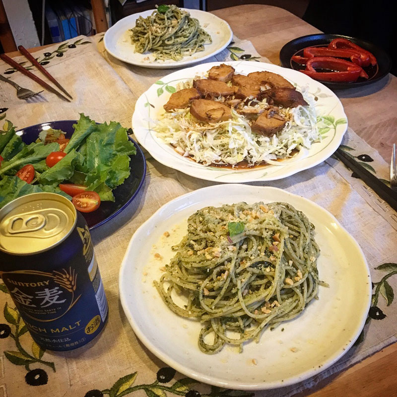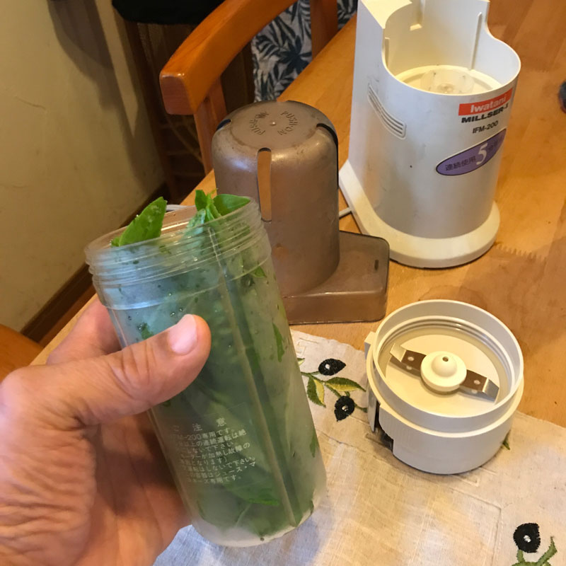 カミさんが仕事で夜遅い時にひとりでパスタ・ジェノベーゼ作って食べていたので、カミさんはまだ今季一度も食べてないからとのリクエストで畑からバジル摘んできてジェノベーゼ。