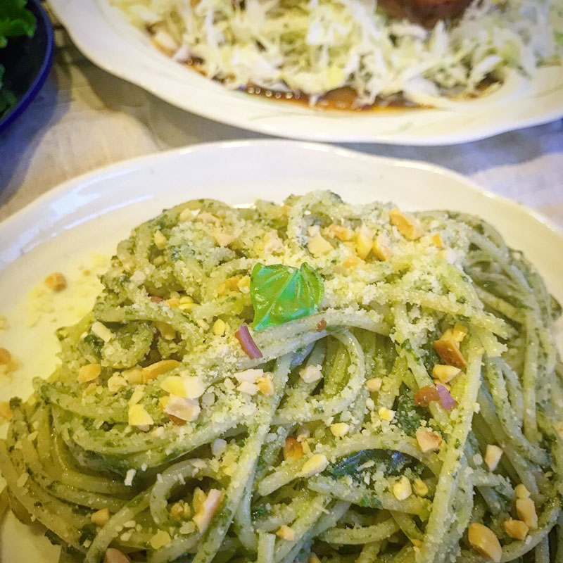 ペストジェノベーゼ作る時、最近は粉チーズやナッツを混ぜないでバジルと塩とオリーブオイルだけでソースを作って盛り付けてから粉チーズとナッツをかけるのが好み。