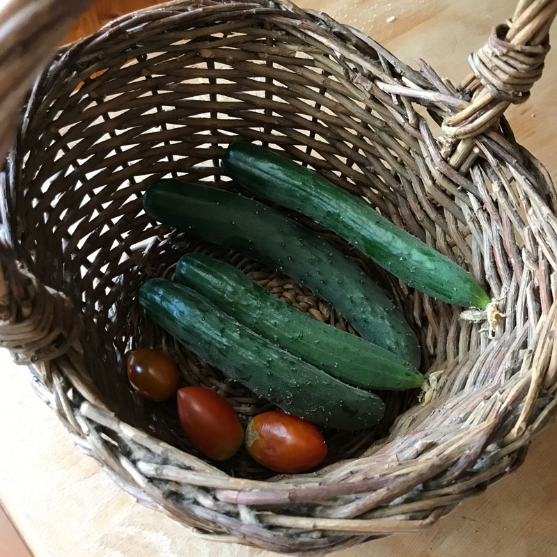 今朝の収穫。このペースだときゅうりの消費が追いつかなくなる。今の季節、いただく野菜の筆頭もきゅうりとナスだし。