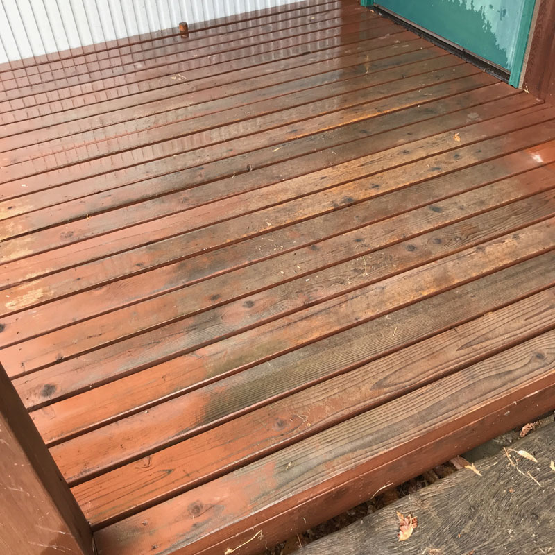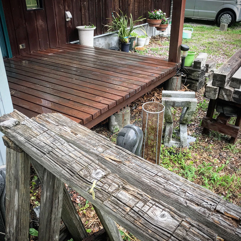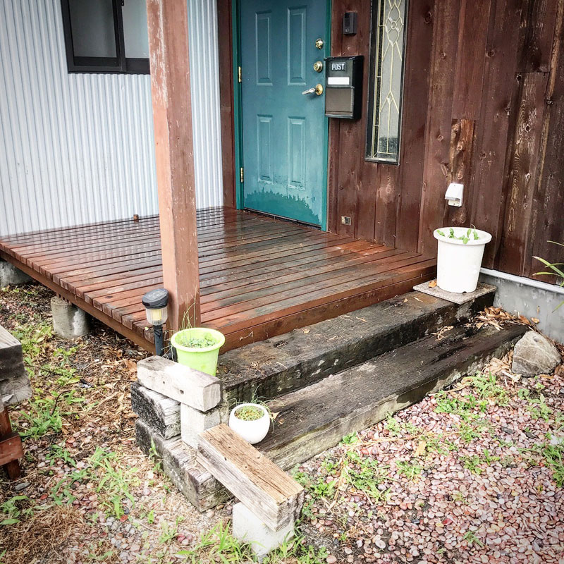 玄関のウッドデッキは一度塗り直したけど我が家が音楽教室という事もあって摩耗が激しい。