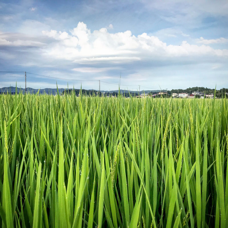 今朝の田んぼ。稲穂、葉先の水滴。イネの花粉の匂いでいっぱい。